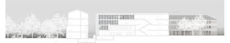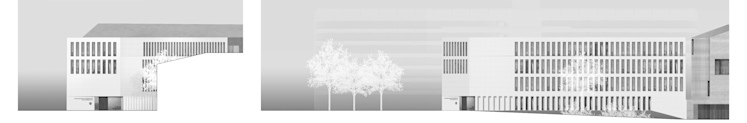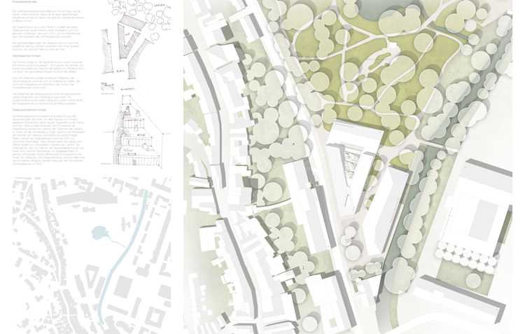 Wettbewerbsbeitrag für den neuen Standort des Deutschen Dokumentationszentrums für Kunstgeschichte - Bildarchiv Marburg. Das dreieckige Grundstück wird voll ausgenutzt, der Baukörper bildet gemeinsam mit einem Seminargebäude und dem Deutschen Sprachatlas ein Ensemble in unmittelbarer N ähe zum Fuß der Altstadt und dem dort liegenden Botanischen Garten.