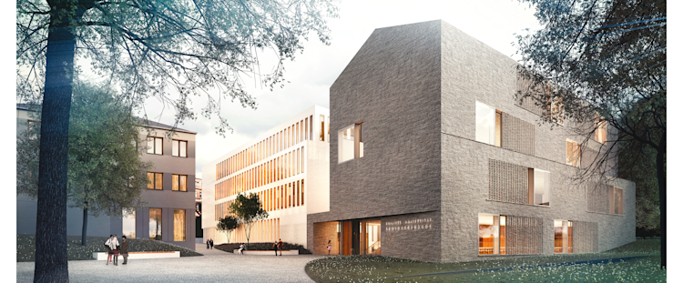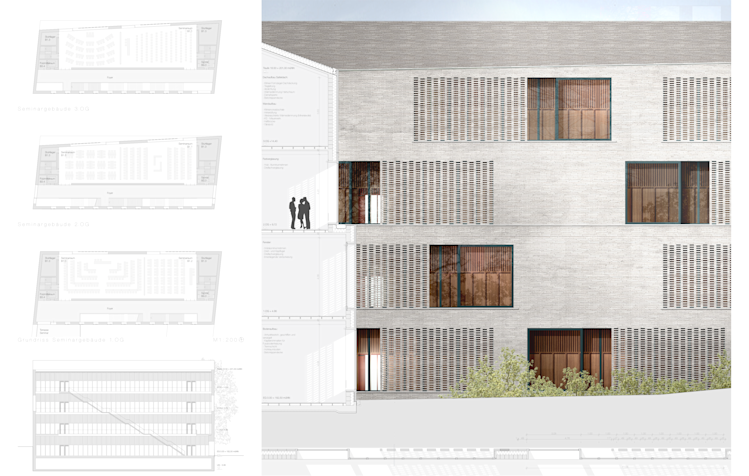 Die schwarze Ziegelfassade des Seminargebäudes bildet den Abschluss zum Botanischen Garten und verdient deswegen besondere Aufmerksamkeit. Das aufwendig detaillierte Filtermauerwerk vor großzügiger Verglasung erlaubt zugleich Blicke in den denkmalgeschützten Garten und gibt Privatsphäre in den unteren Geschossen. Eingänge werden durch eine helle Laibung betont.