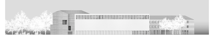 Der Grundriss des Seminargebäudes gliedert sich einfach aus zwei nebeneinander liegenden Raumspangen: den Verkehrsflächen mit Sanitärräumen und den flexibel einteilbaren Seminarräumen.