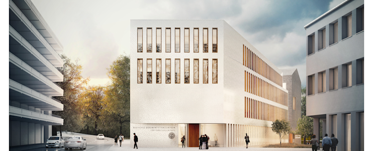 Ds.er Innenraum vom DDK wird über zwei überschneidende Hallen erschlossen, eine dient als halb-öffentlicher Tagungsbereich um dessen zentralen Saal, der zweite bietet dem Personal eine gute Orientierung als zentraler Zugang zu den Büro-, Werkstatt-, Archiv und Bibliotheksbereichen.