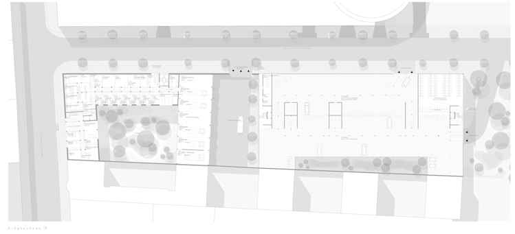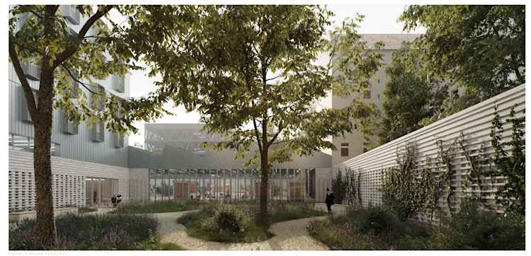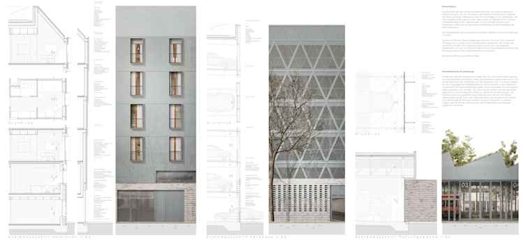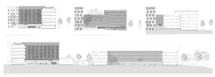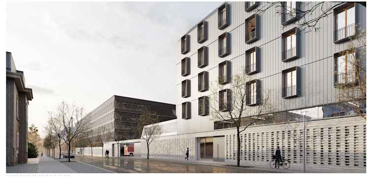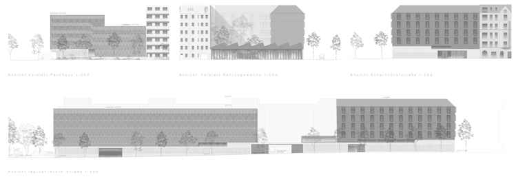 Anstatt das Gelände einzuzäunen schlagen wir eine, durch vereinzelte Eingänge und Höhensprünge akzentuierte, relativ geschlossenen Erdgeschosszone vor, auf der die Baukörper (die Unterkünfte und das Parkhaus) ruhen. Für diese schlagen wir eine ruhig-gegliederte Metallfassade vor, die im Kontrast zu dem steinernen Sockel steht. Die Apartmentfassaden wirken durch Holzfenster und französische Balkone klassisch und wohnlich. Die Dienstzimmer erhalten ein durchlaufendes Glasband mit darunter liegender Brüstung, optimal für die Büronutzung. Das Parkhaus wird in ein gestaltetes aber pragmatisches, leichtes und offenes Gitterrostkleid gehüllt. Hinter dem Filtermauerwerk des Sockels können Räume nach Notwendigkeit Öffnungen erhalten ohne an Privatsphäre zu verlieren. Zugleich gibt die Struktur der Bauwerke dem Straßenraum einen attraktiv gestalteten Abschluss.