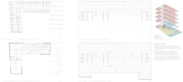 Apartmentgebäude, Fahrzeughalle und Parkhaus sind dabei drei eigenständige Baukörper, wodurch die Realisierung des Parkhauses bei Bedarf vorgezogen werden kann. Die stützenfreie Dachkonstruktion der Fahrzeughalle wird nicht durch Obergeschosse belastet, die Hüllen Apartment und Fahrzeughalle werden gemäß ihren unterschiedlichen Anforderungen thermisch voneinander getrennt. Gestalterisch werden die drei Körper durch deren gemeinsame Materialität und den gemeinsamen Sockel zusammengefasst.
