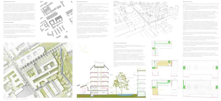 Unser Wettbewerbsbeitrag sieht vor, die benachbarte Randbebauung auf dem Grundstück des Bundeswehrkrankenhauses fortzuführen. Der Entwurf folgt mit seinem umlaufenden Mauersockel dem Verlauf der umliegenden Straßen. Die Baukörper schließen an den vorhandenen Brandwänden an und nehmen die Hofstrukturen auf. Der L-förmige Körper (Rettungswache und Unterkünfte) orientiert sich an der Traufhöhe des Nachbarbaus an der Scharnhorststraße und führt das Volumen um die Ecke zur Ida-von-Arnim-Straße. Das Parkhaus nimmt ebenso die Fluchten der benachbarten Wohnbebauung auf.