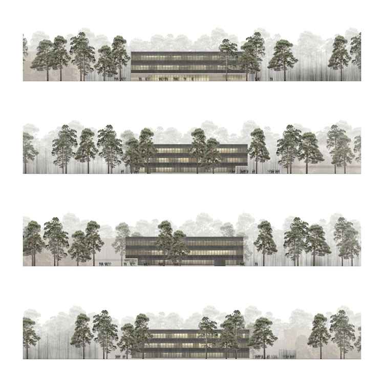 Die Arbeit spielt städtebaulich mit versetzten Baukörperfluchten, welche dem Ziel dienen, im Norden des Campus einen offenen Grünraum als Auftakt zu formulieren.