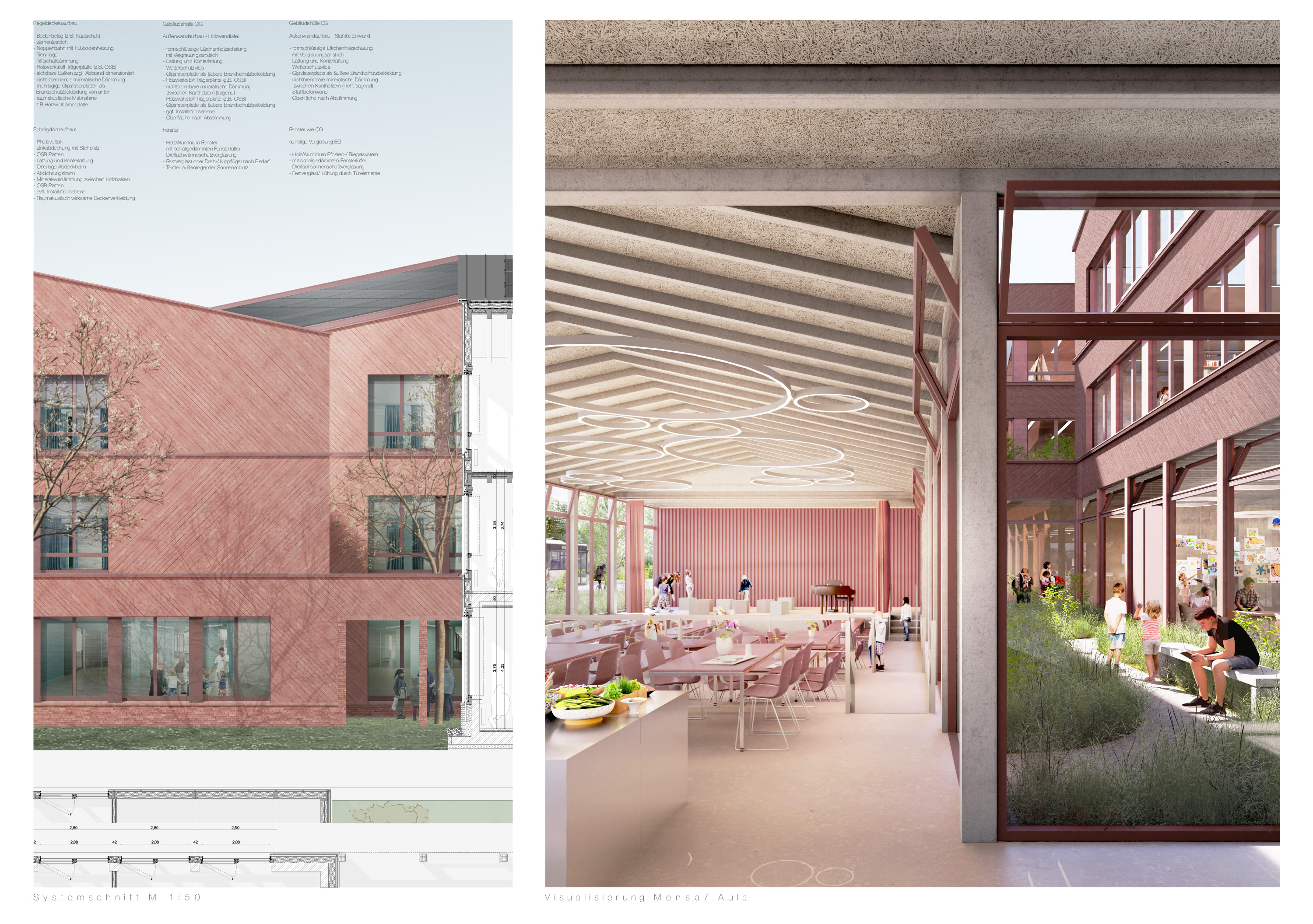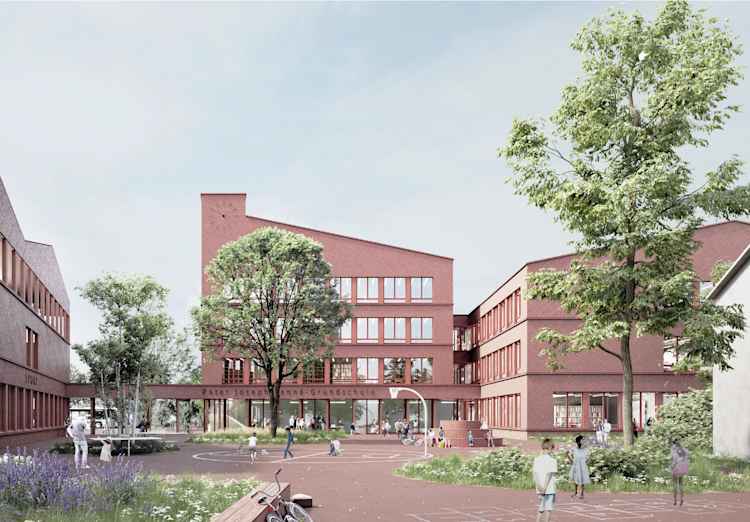 Der Wettbewerbsbeitrag erschafft eine Spiel-und Lernlandschaft, die sich vom grünen Außenraum, dem eigentlichen Dorfanger an der Rudolph-Breitscheid-Straße, durch das Grundstück, bis hin zum Haupteingang und weiter im Gebäudeinneren als Schulstraße durch die Nutzungsbereiche zieht. Der Ort wird so als Ganzes aufgewertet und die Schule leistet ihren Beitrag zum öffentlichen Leben.