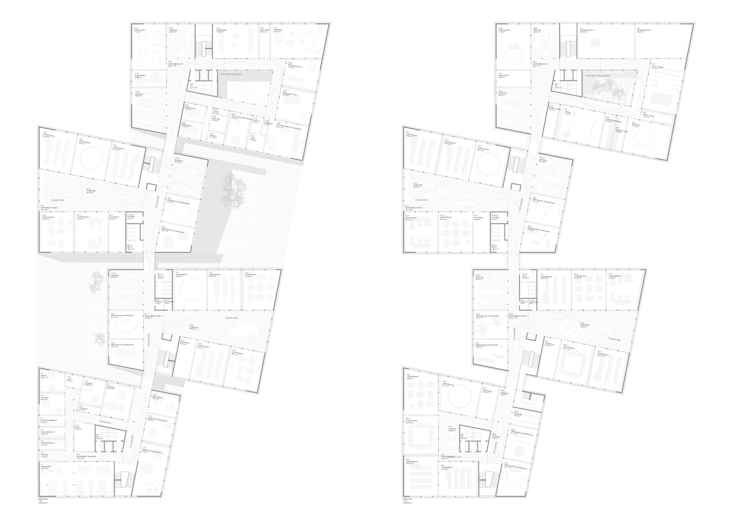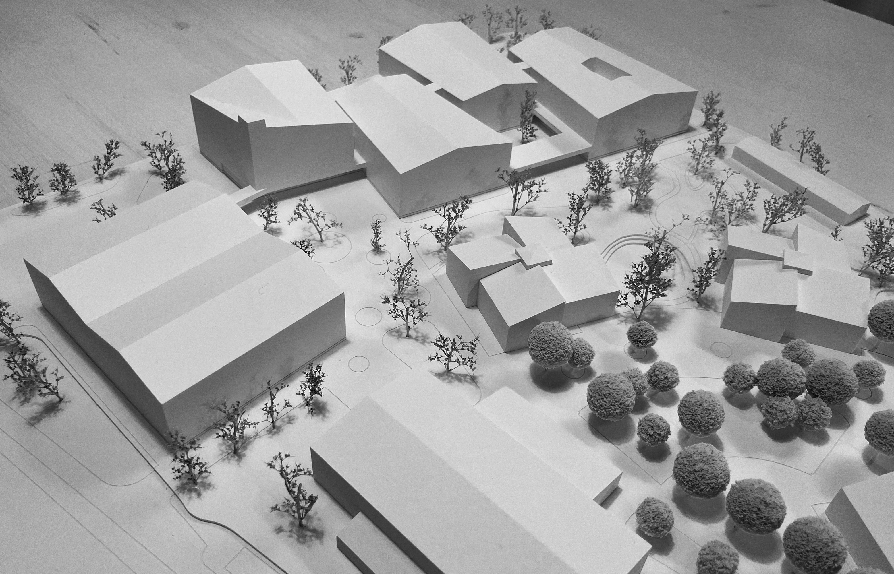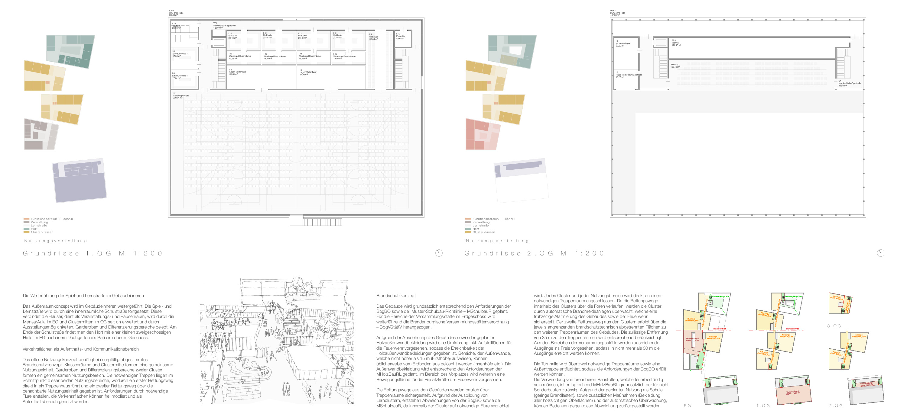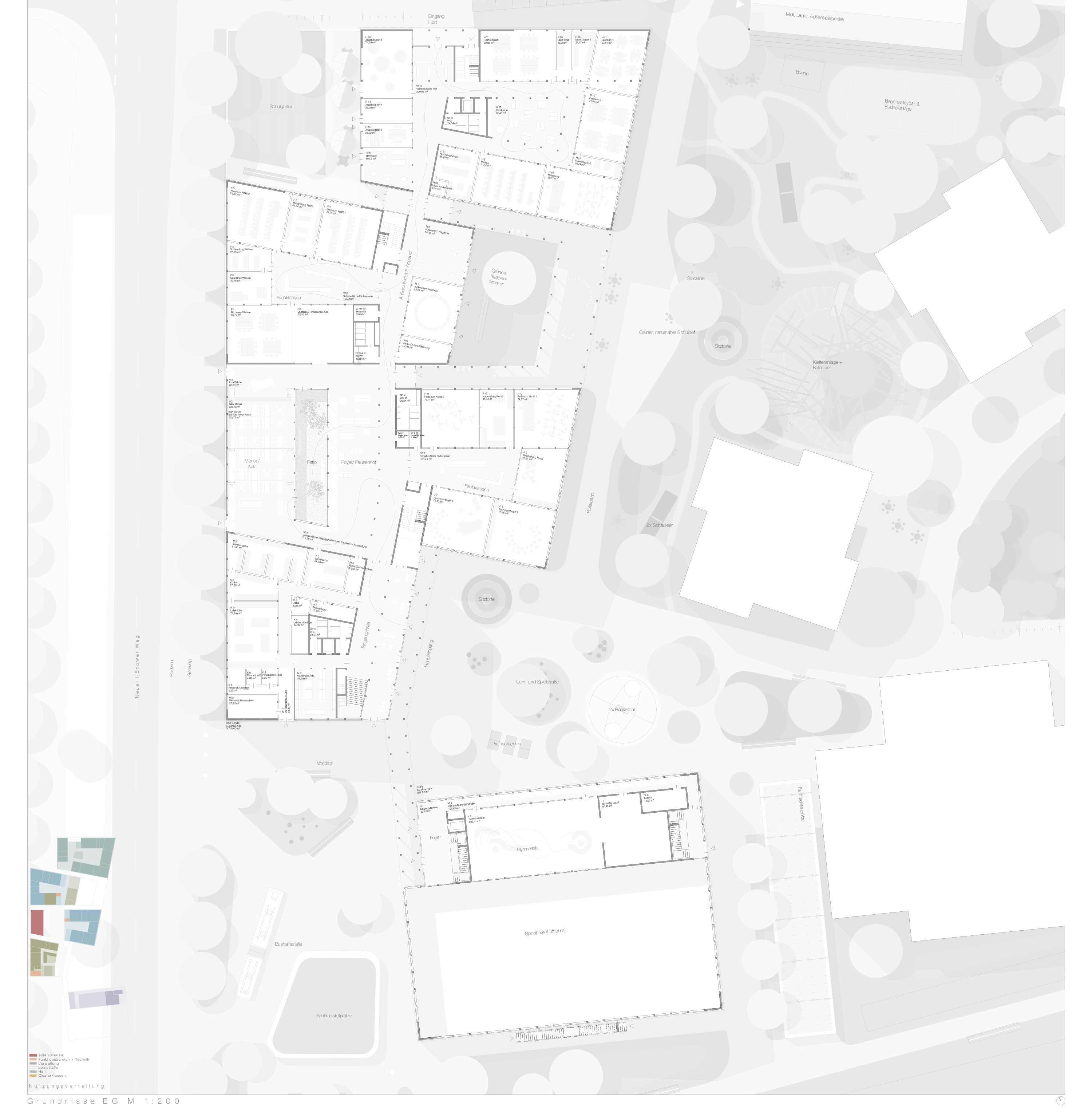 Die einzelnen Baukörper sind kompakt und flächenschonend angeordnet, was grundlegend für die ökonomische und ökologische Zielsetzung ist. Darüber hinaus begünstigt es kurze interne Wegeverbindungen. Während der nord-westliche Teil des Grundstücks eine städtische Dichte erhält bleibt der südliche Teil weitgehend unbebaut, hier entfaltet sich eine Sportfelder- und Aktivitätenlandschaft, die landschaftlich eingebunden werden kann.