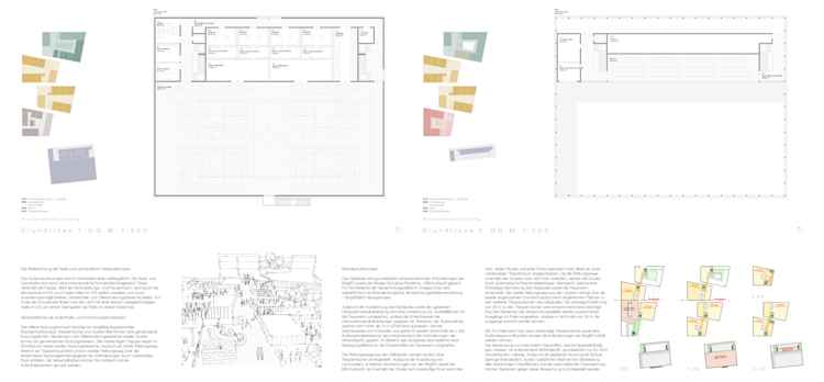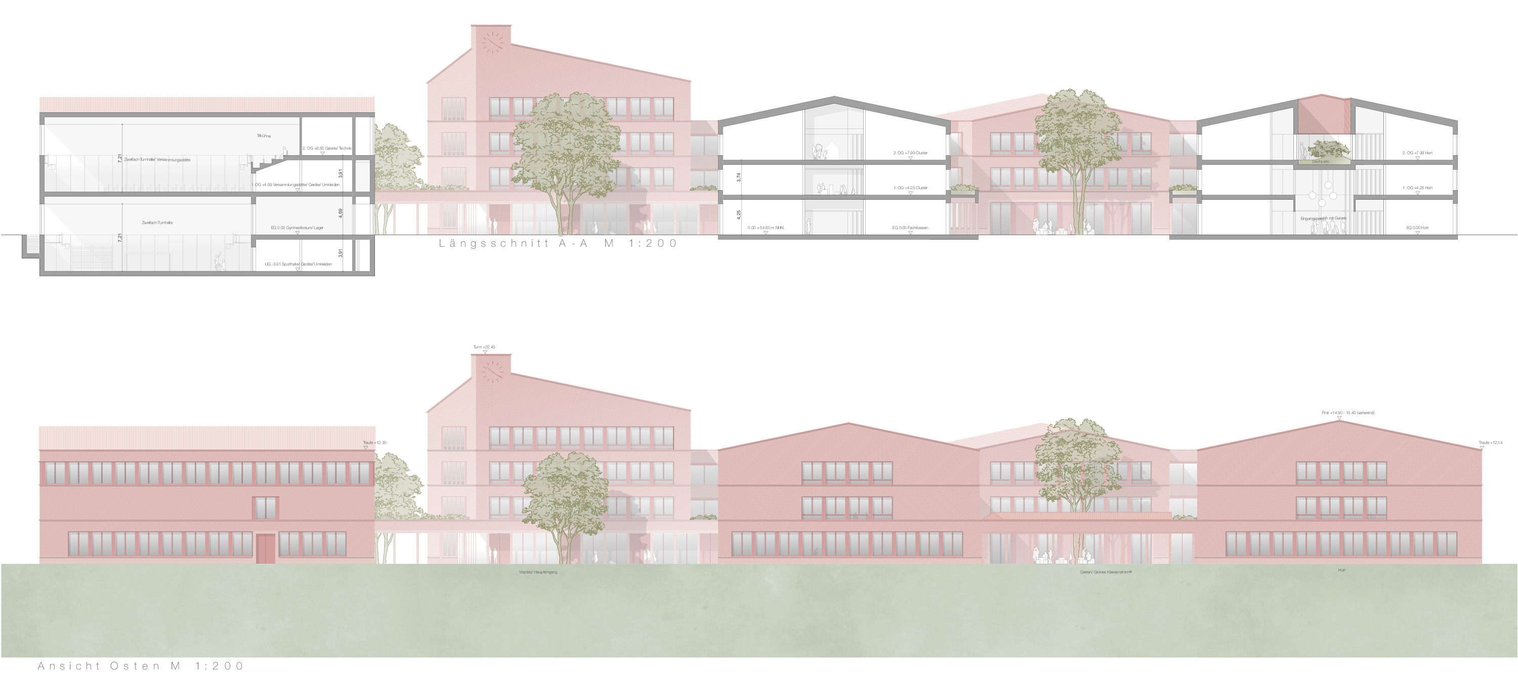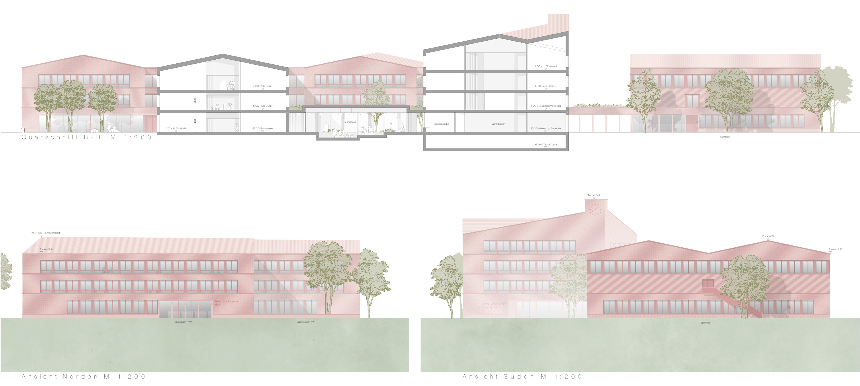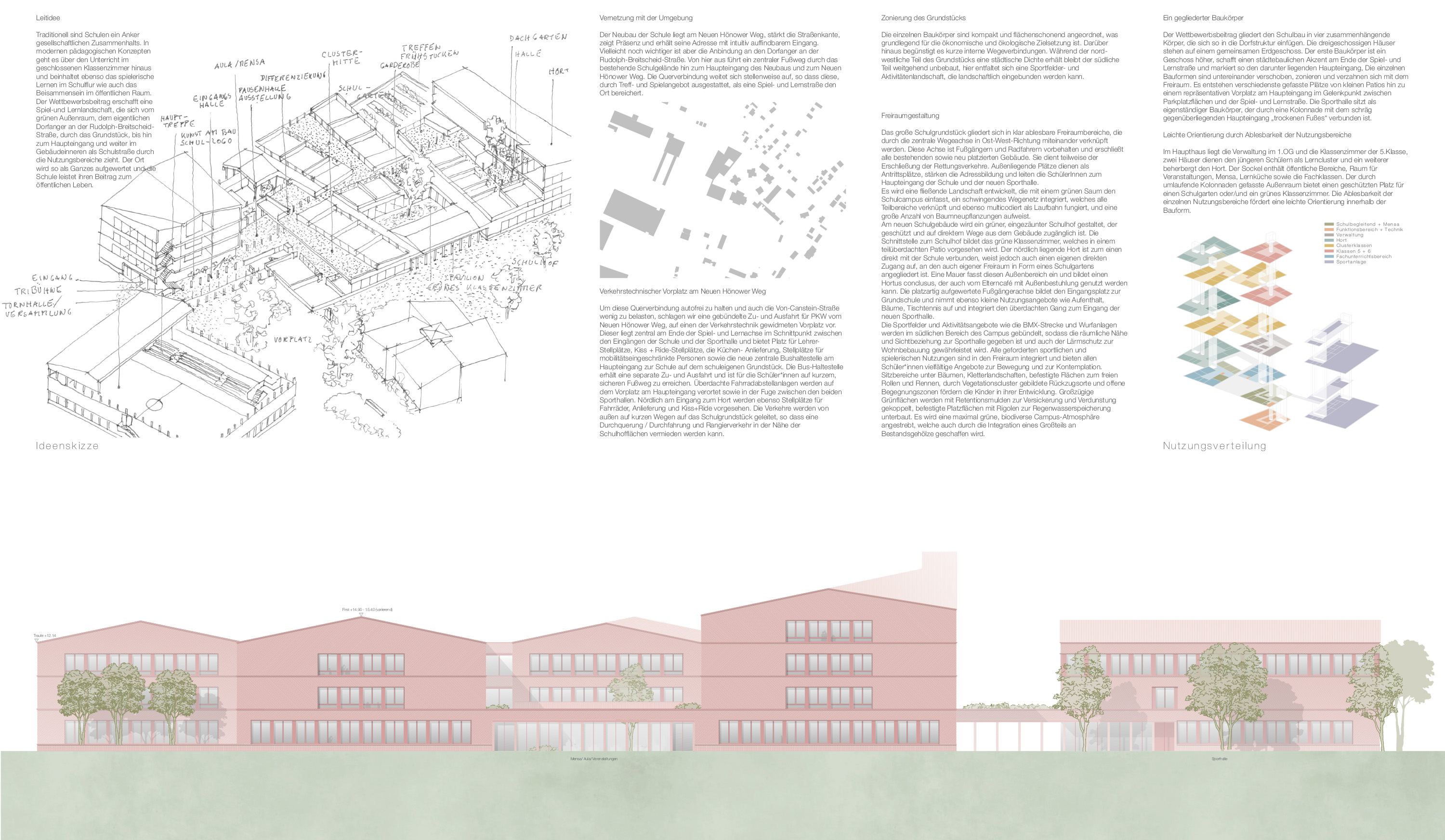 Der Wettbewerbsbeitrag gliedert den Schulbau in vier zusammenhängende Körper, die sich so in die Dorfstruktur einfügen. Die dreigeschossigen Häuser stehen auf einem gemeinsamen Erdgeschoss. Der erste Baukörper ist ein Geschoss höher, schafft einen städtebaulichen Akzent am Ende der Spiel- und Lernstraße und markiert so den darunter liegenden Haupteingang, Die einzelnen Bauformen sind untereinander verschoben, zonieren und verzahnen sich mit dem Freiraum. Es entstehen verschiedenste gefasste Plätze von kleinen Patios hin zu einem repräsentativen Vorplatz am Haupteingang im Gelenkpunkt zwischen Parkplatzflächen