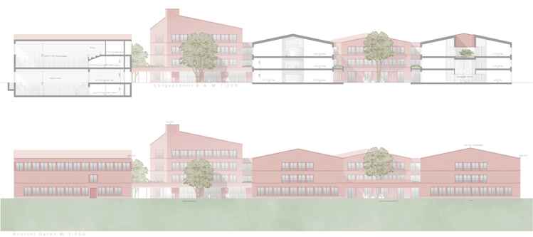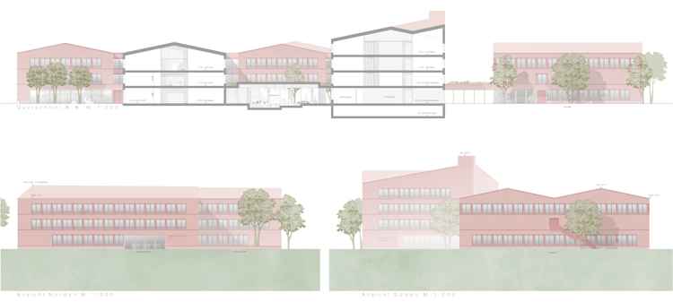 Der Entwurf schafft es, dass alle Bestandsbauten erhalten bleiben können oder zu einem späteren Zeitpunkt unabhängig von der Schulnutzung neu entwickelt werden können.
