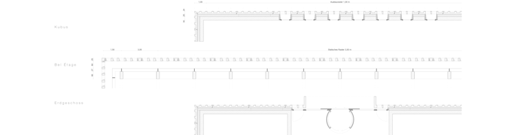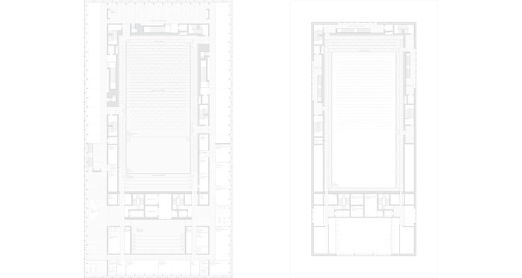 Der Gebäudegrundriss folgt einem einfachen Diagramm. Im Zentrum steht geschützt der große Saal. Er wird durch eine Zone von Technikflächen, Erschließung und Nebenräumen umschlossen. Aufenthaltsbereiche bilden einen zweiten Ring, welcher von den Außenbezügen und dem Tageslicht profitiert. Innerhalb dieser Struktur gibt es eine klare Trennung zwischen dem Vorder- und dem Hinterhaus.