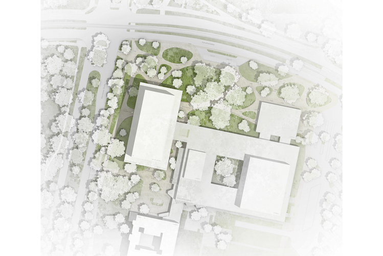 Das geplante Gebäude ist ikonisch, seine Form klar und einfach. Der Baukörper ruht in sich selbst, in seiner Objekthaftigkeit ist er nicht Teil eines urbanen Gefüges, sondern steht als Solitär in der Lichtung des Luitpoldhain. Er ragt hier weit über die Baumkronen hinaus und schafft einen markanten städtebaulichen Akzent, der den Beginn der südlichen Innenstadt Nürnbergs markiert.