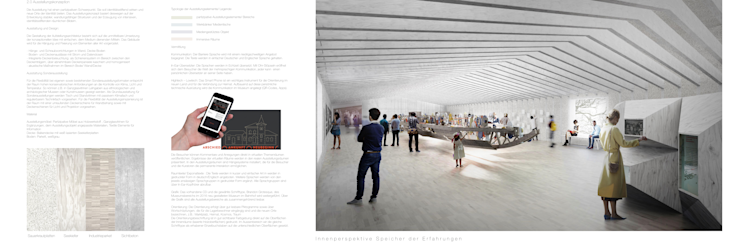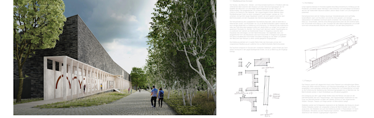 Der Wettbewerbsbeitrag beschreibt ein Gebäude, das die Besucher:innen vom ehemaligen Bahnhof hin zum Grenzdurchgangslager begleitet. Im Erdgeschoss zeigt sich das zweigeschossige Bauwerk einladend, transparent und kommunikativ; hier befindet sich ein Markplatz des kulturellen Austausches. Die großzügigen, flexiblen und introvertierten Ausstellungbereiche im Dachgeschoss gleichen einem Speicher für Erinnerungen.